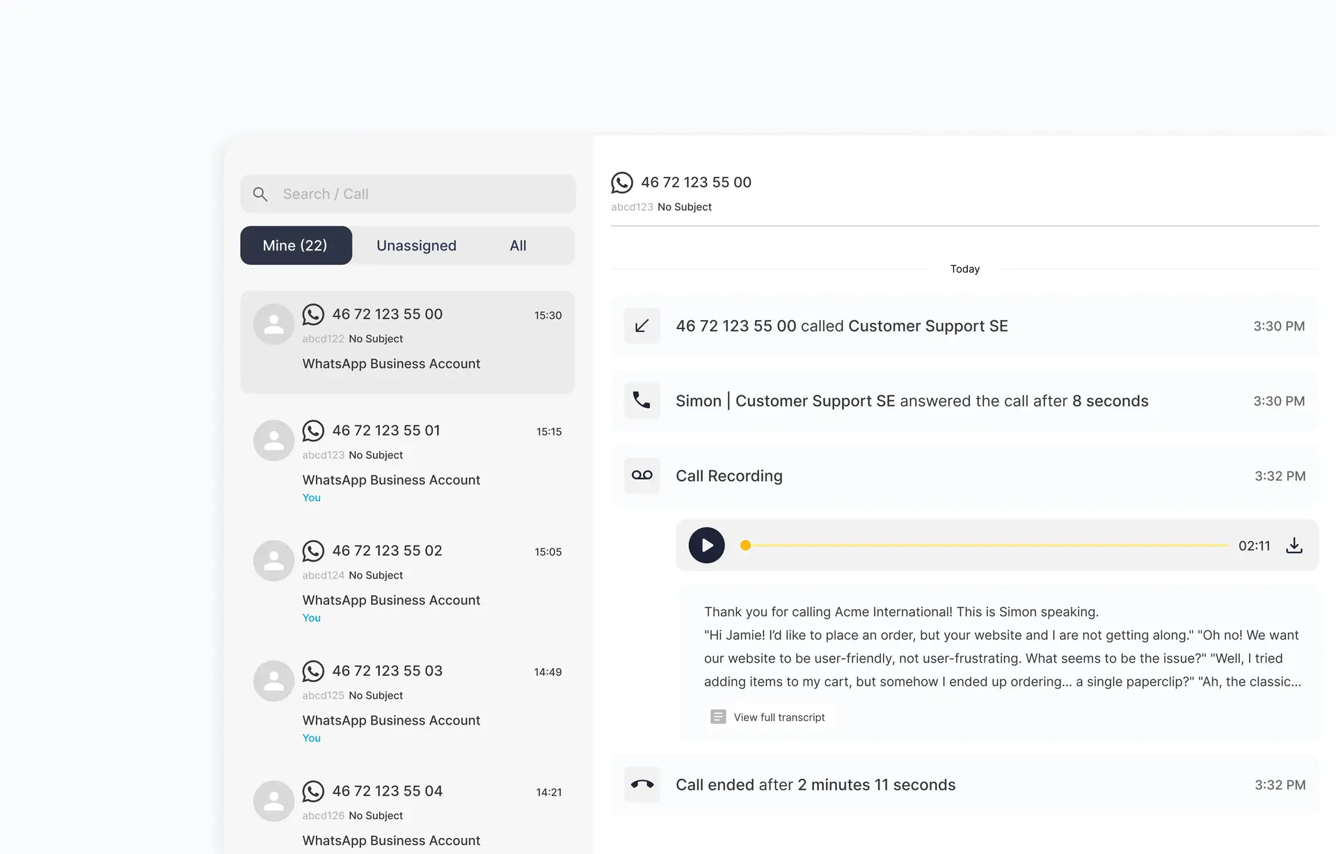 Notre transcription IA pour la gestion des tickets rend le support client plus fluide et plus efficace. Les appels reçus via votre service client ou votre système de files d’attente sont automatiquement convertis en texte, les tickets sont étiquetés et triés, et l’IA suggère des réponses que vous pouvez utiliser pour le suivi. Cela signifie moins de travail manuel, une gestion plus rapide et une meilleure expérience pour les équipes de support et les clients.