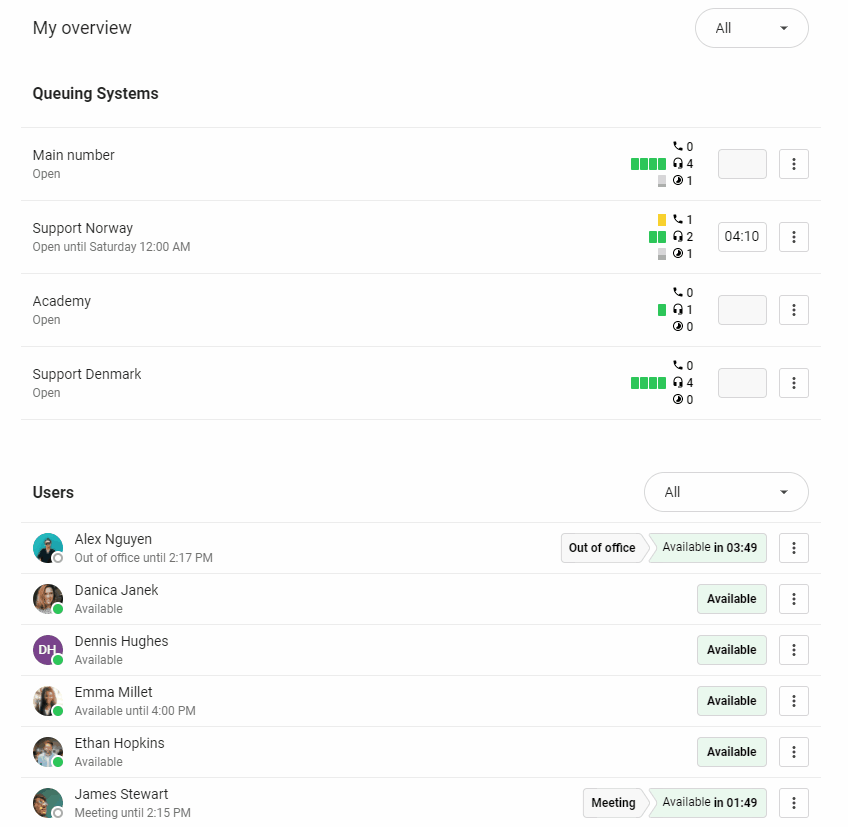 Ma vue d’ensemble est une page sous l’onglet Standard de notre softphone qui vous montre un aperçu de vos files d’attente et de vos agents. Dans cette vue, vous pouvez voir des indicateurs tels que le nombre d’appels en file d’attente, le nombre d’utilisateurs connectés et disponibles, ainsi que le temps d’attente le plus long pour vos files d’attente.
