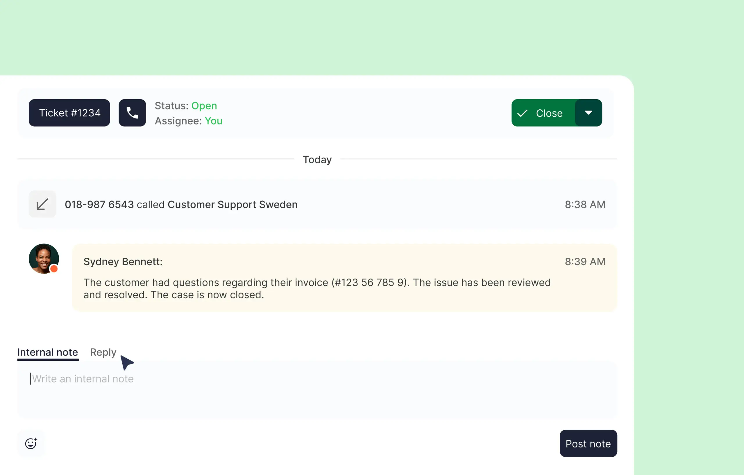 Grâce à notre système de tickets, des tickets de support sont créés automatiquement à partir des appels entrants directement dans l’application. Vous pouvez facilement collaborer avec vos collègues en partageant des notes internes et en laissant notre service d’IA résumer l’appel pour vous. De cette façon, vous avez toujours une vue d’ensemble complète des tickets en cours et résolus, ce qui simplifie la gestion et améliore le service pour vos clients. Préférez-vous intégrer à votre système de tickets existant ? Apprenez-en davantage sur nos intégrations ici.