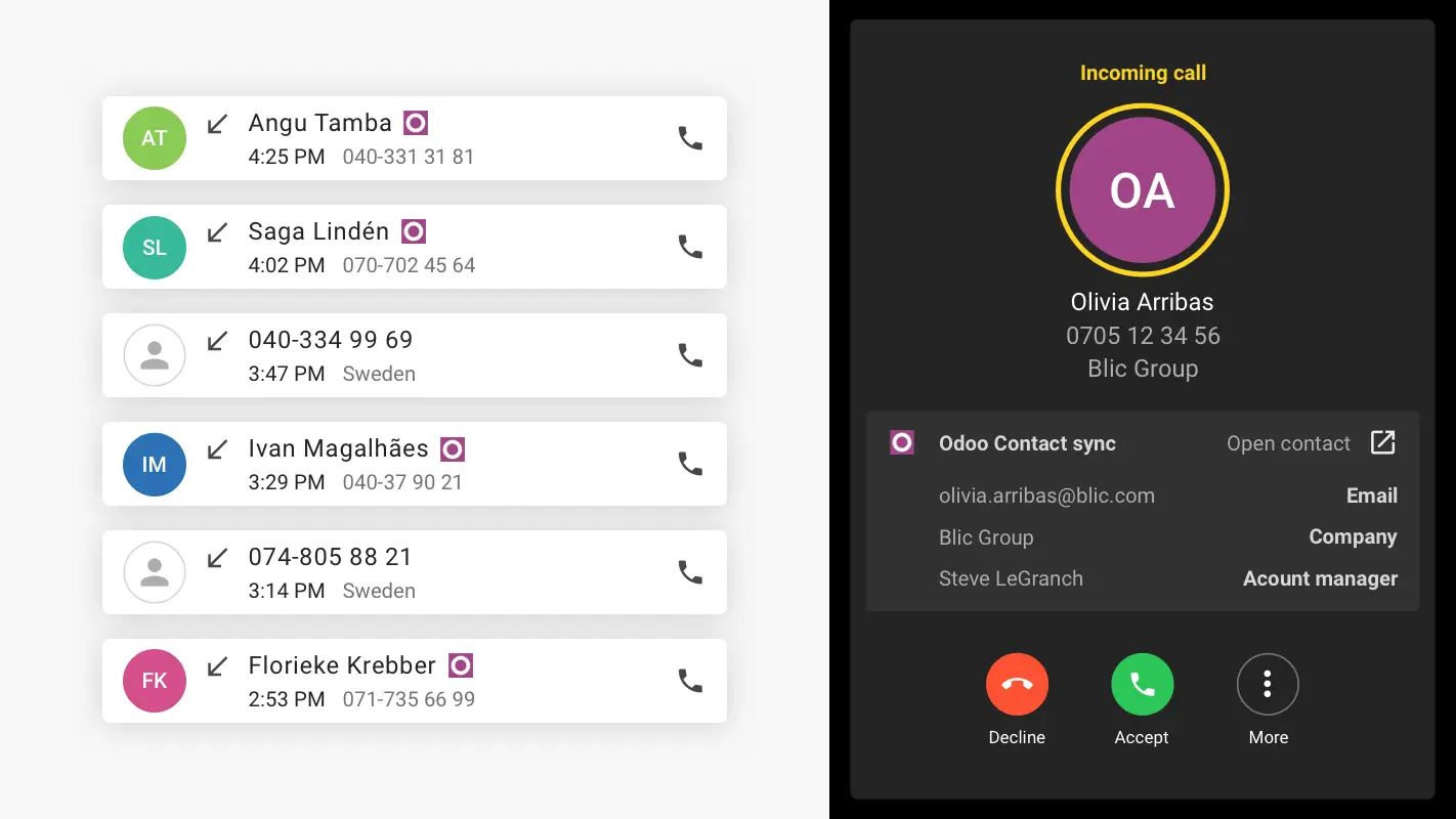 Évitez de rechercher des informations que vous possédez déjà. Toutes les données pertinentes sont automatiquement extraites d’Odoo, ce qui réduit le travail manuel et augmente l’efficacité. - Accès facile aux profils des clients