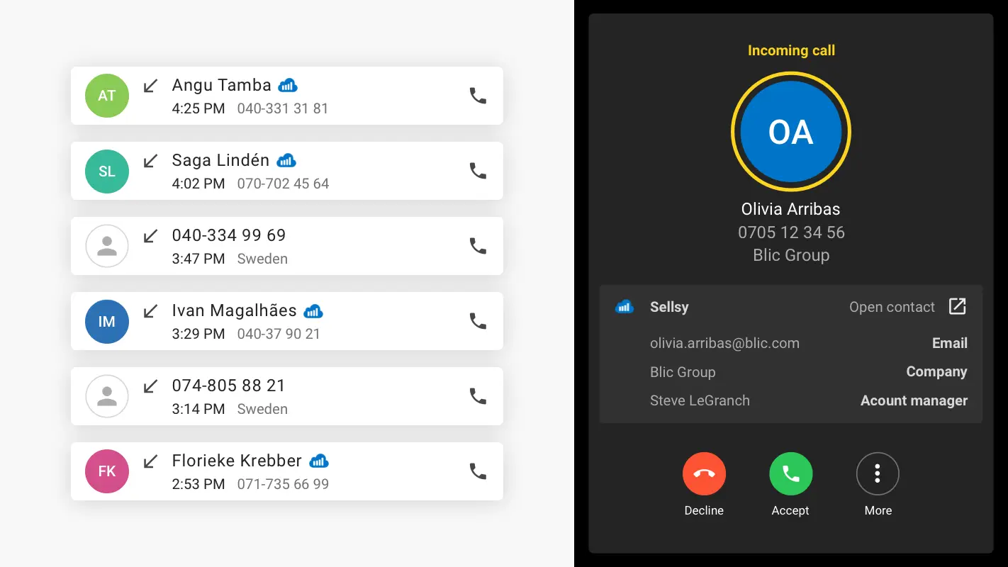 • Obtenez directement des informations sur les clients : Regardez qui vous appelle et obtenez des informations importantes dans Telavox avant de répondre. Cela vous permet de traiter l’appel rapidement et efficacement.