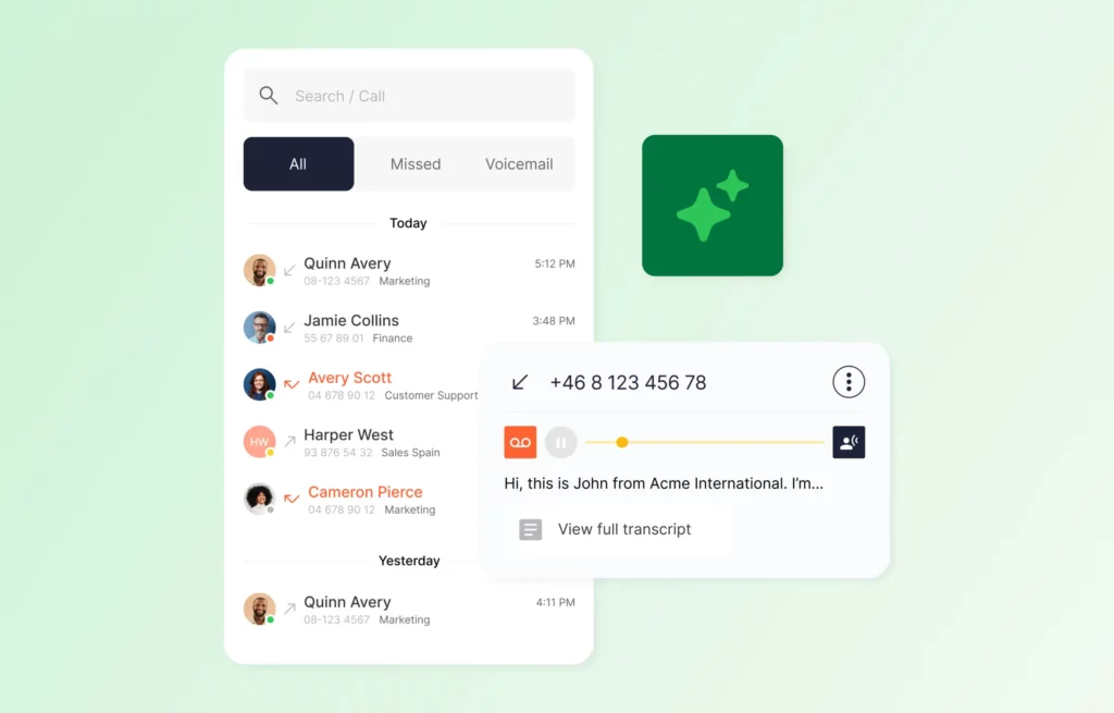 Grâce à notre fonctionnalité d’IA et à la transcription des appels, vous pouvez obtenir des résumés automatiques après chaque appel. Cela permet de gagner du temps, de faciliter le suivi des détails importants et d’éviter que des informations importantes ne soient perdues.