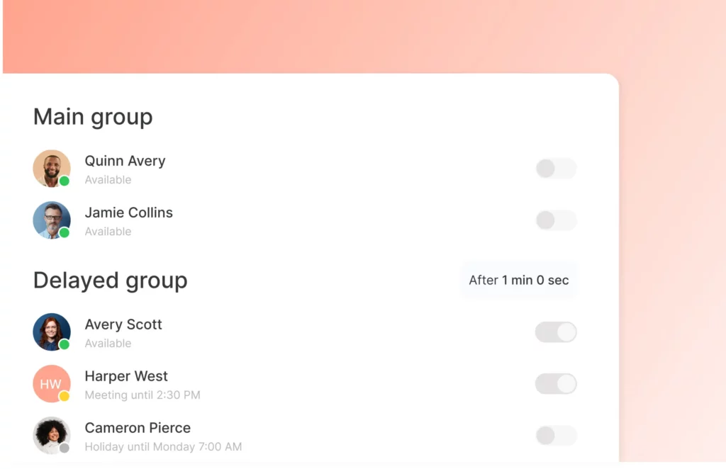 Si vous souhaitez que certains membres d’un groupe prennent les appels lorsque d'autres ne peuvent pas répondre à temps, vous pouvez utiliser la fonction de répartition des appels différée. Cela vous permet de définir qui recevra les appels et de choisir combien de temps il faut attendre avant que ces membres prennent le relais.